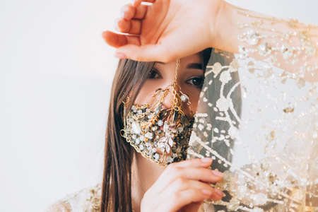 Ethnic beauty look. Pandemic fashion. Christmas fancy ball party. Woman in sheer glossy dress designer golden chain crystal face mask posing on camera isolated on white.