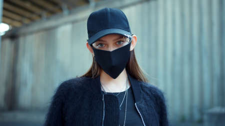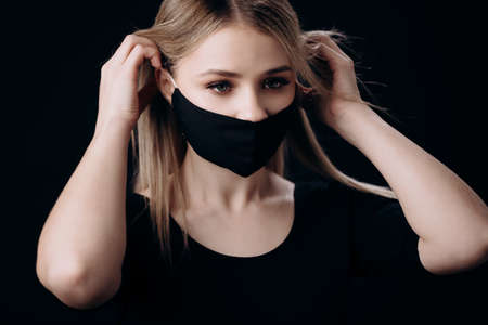 COVID-19 Pandemic Coronavirus A young woman on a dark backgound in a protective mask. Girl with a black mask on her face against coronavirus disease