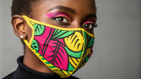 The portrait depicts a person with a uniquely designed neon mask that features a mix of abstract patterns in bright colors like pink yellow and green. Their vibrant eyes shine with.