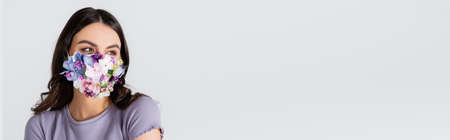 Young woman wearing a medical mask made of flowers during a pandemic.