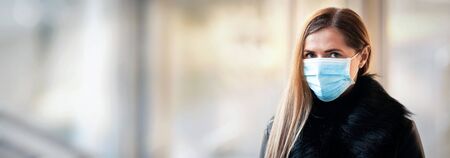 Young woman wearing disposable blue virus face mouth nose mask, closeup portrait - wide banner with space for text left side. Coronavirus covid-19 outbreak prevention concept