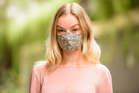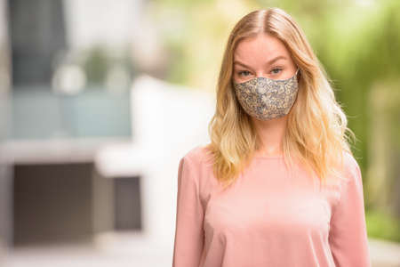 Face of young blonde woman wearing mask in the city with nature outdoors