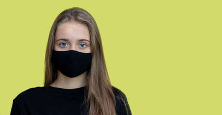 A beautiful young girl in a black t-shirt with a reusable face mask on a yellow isolated background. Concept of protection against viruses and infections. Close-up, banner, copy space.
