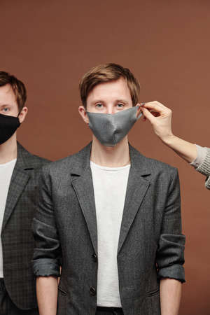 Hand putting mask on ear to young guy in gray suit standing with twin brother against brown background