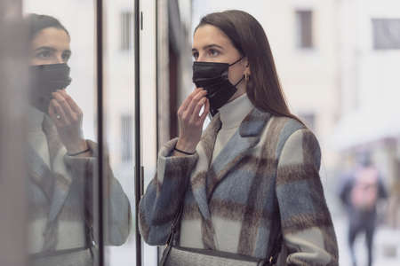 Fashionable black medical mask with filter in the city. Coronavirus 2019-ncov epidemic concept. Woman in a black medical mask. Portrait of a woman with expressive eyes during a virus or disease epidemic of Coronovirus