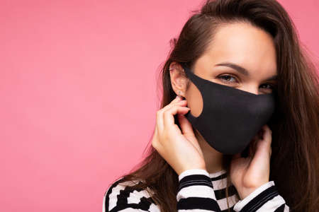 Woman wearing stylish protective face mask, posing on pink background. Trendy fashion accessory during quarantine of coronavirus pandemic. Close up studio portrait. Copy, empty space for text.