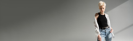 pretty blonde woman in tank top and white shirt posing on grey background with shadows, banner