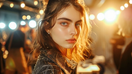 A captivating portrait of a confident young woman showcasing artistic apparel. The unique design and striking lighting create a powerful visual impact, embodying style and individuality.
