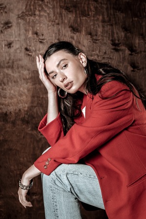 Beautiful brunette. Nice attractive woman touching her hair while looking at you