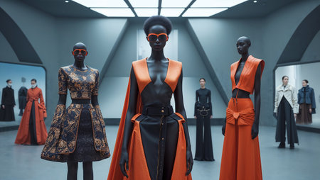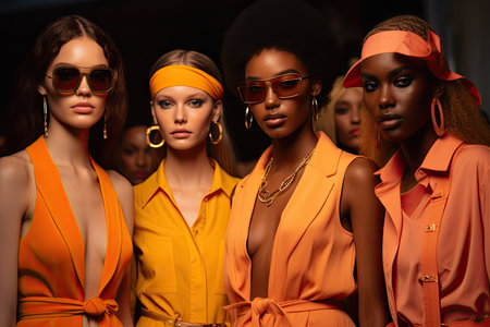 Fashion models showcasing avant garde orange and black outfits in a futuristic setting. Ai generated image