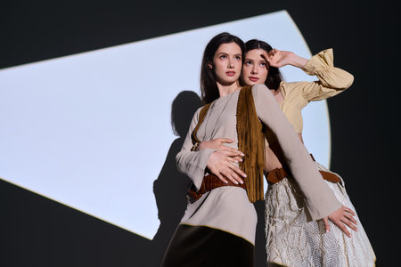 Two beautiful twin sisters pose elegantly in fashionable attire with striking shadows.