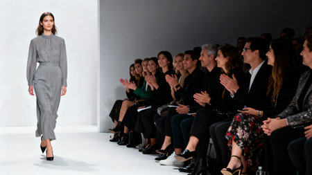 Female Model Walking Runway Under Spotlight, Wearing Grey Knit Ensemble While Audience Applauds From Front Row Photographers Capture Poised Stride Across Minimalist Stage Atmosphere