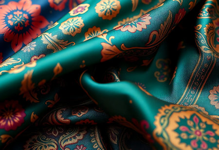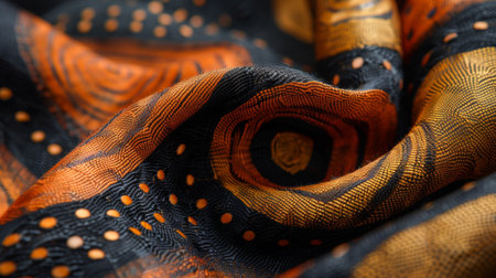 A close-up view of a beautifully patterned fabric featuring warm hues. The delicate material gracefully folds and swirls, showing intricate designs and textures.