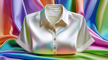 This elegant white satin shirt rests gently on a vibrant, silky background, highlighting its smooth texture and glossy finish, perfect for fashion presentations.