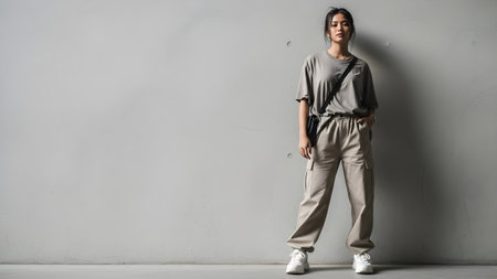 A woman in casual attire stands confidently in front of a solid gray wall, exuding solitude and strength.