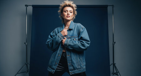 Portrait of a beautiful young blonde woman in jeans jacket posing at studio.