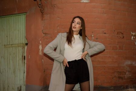 Beautiful lady in spring clothes, wearing a brown coat, standing on the background of a beige wall, looking into the camera. Stylish girl against the background of the wall. Copyspace