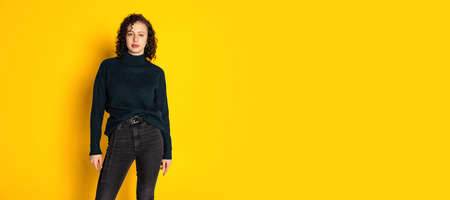 Portrait of young beautiful girl in warm knitted sweater posing isolated on yellow color background