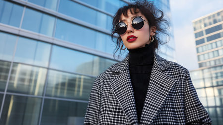 A trendy woman in a checked coat and sunglasses standing beside a modern glass building