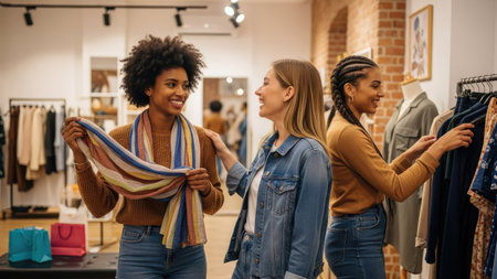 Three diverse women shop for clothing inside a boutique. Natural lighting illuminates the scene, highlighting the textures of apparel. The composition suggests a social interaction, potentially indicating a retail or fashion-related context. Suitable for commercial and editorial purposes.
