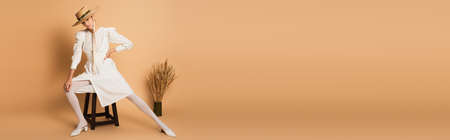 full length of young woman in straw hat posing with hand on hip near wooden chair and wheat spikelets on beige, banner