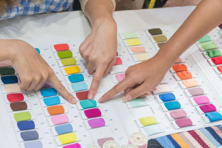 Close up hands of fashion designers are choosing fabric colors.