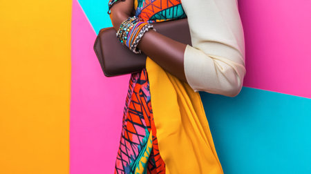 A stylish woman showcases vibrant ethnic fashion against a bright backdrop. Colorful patterns and elegant accessories highlight modern beauty and individuality.