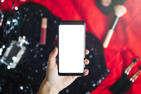 Close up of hand holding mobile phone with blank screen above cocktail dress.