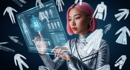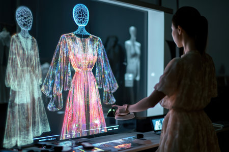 A designer uses a handheld device to manipulate holographic fashion designs in a modern studio setting.