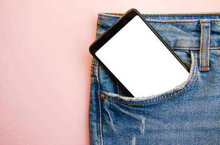 White screen smartphone in jeans pocket. Smartphone place for text. Smartphone in a pocket on a pink background. Copy Space