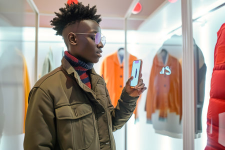 Person using an augmented reality (AR) virtual fitting room app, trying on clothing virtually.
