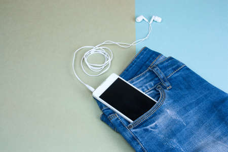 Headphones and smartphone in the pocket of jeans. Smart phone in the pocket jeans.