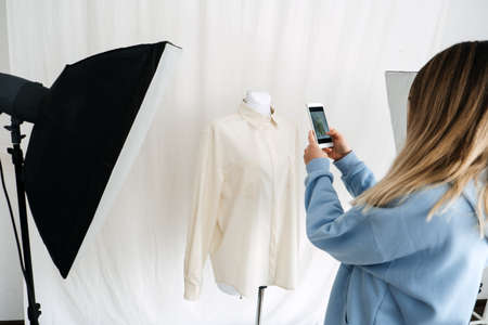 Ecommerce and sell online. Woman taking picture of clothes in the shop. Second hand, Selling used clothes.
