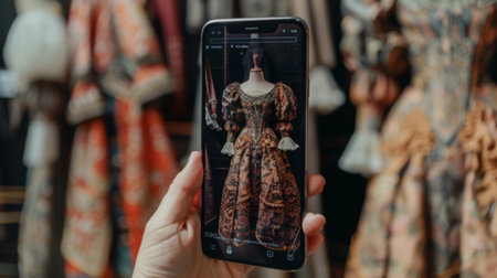 Inside a brightly lit store, a person holds a tablet displaying dresses with augmented reality.