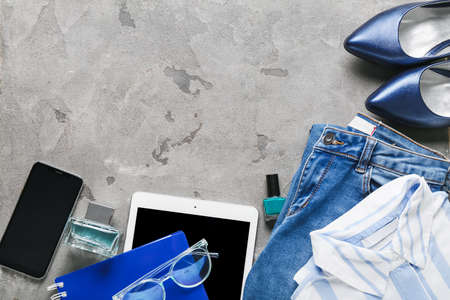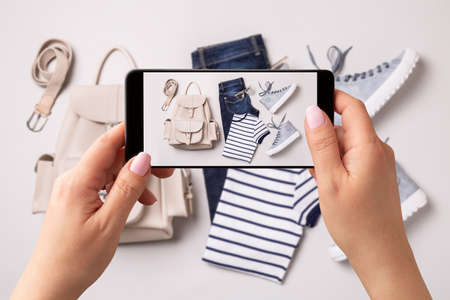 Woman taking photo of clothes (jeans, t-shirt, sneakers, backpack) with smartphone. Blogger, influencer or stylist capturing spring fashion outfit and accessories for social media.