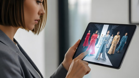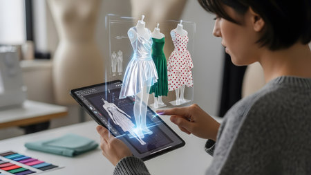 Designer uses tablet to view and select from holographic dresses in a studio. Clear details and v...