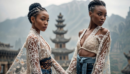 Two young women stand side by side, showcasing their natural features and contemporary fashion in a modern indoor space. Their expressions are serene and confident.