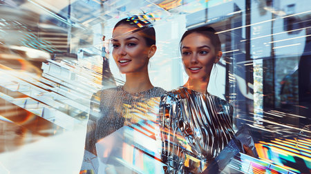 Futuristic fashion models posing with abstract light reflections