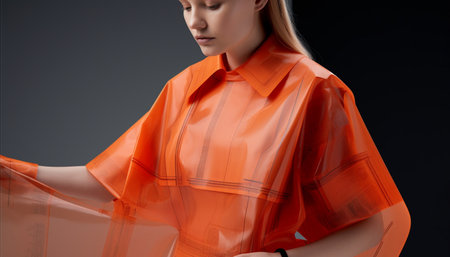 Caucasian fashion model standing, looking confident in orange shirt, smiling generated by artificial intelligence