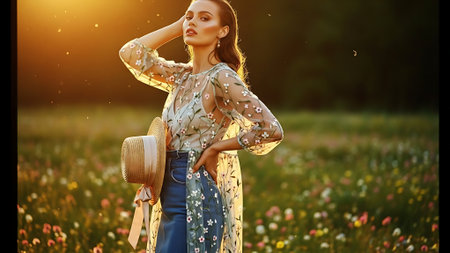 Beautiful young woman in a field of flowers. Beauty, fashion.