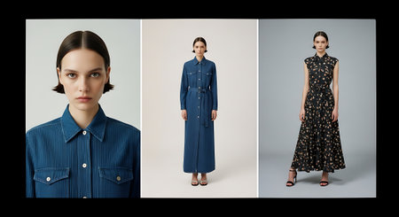 This stylish fashion magazine cover collage features contemporary minimalist fashion designs, focusing on elegant attire choices complemented by vibrant colors.