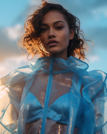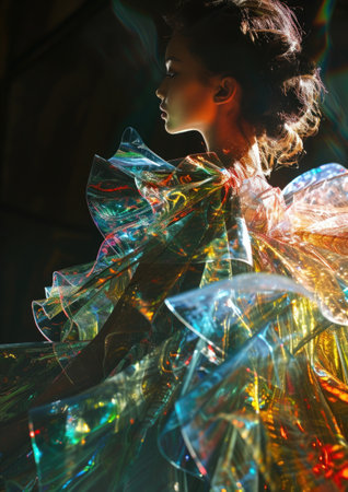 Young Asian Woman with Reflective Holographic Light Patterns on Face and Shimmering Outfit Against Iridescent Background AI Generative