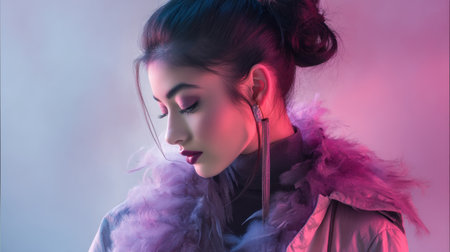 A stunning profile shot of a young woman showcasing her beauty in a fashionable jacket, illuminated by soft colorful lights, creating a serene atmosphere.