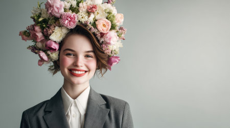 Young woman wearing blue jacket and pink shirt holding beautiful pastel peony bouquet in front of face on gray background