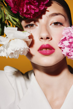 Close-up of fashion model with glossy pink lips surrounded by vibrant peony flowers on yellow background. Creative beauty shot emphasizing color and texture.