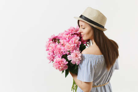 Young tender woman in blue dress, hat holding bouquet of beautiful pink peonies flowers isolated on white background. St. Valentine's Day, International Women's Day holiday concept. Advertising area