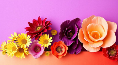 Flowers composition. Colorful artificial flowers on colorful background. Flat lay, top view, copy space