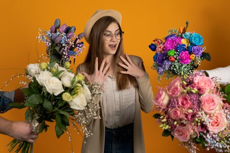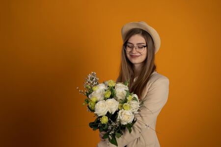 Joyful girl in glasses holding flowers on yellow background