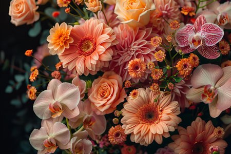 Bouquet of pink and orange orchids on black background