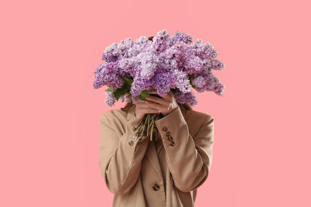 Pretty young woman hiding face behind bouquet of lilac flowers on pink background